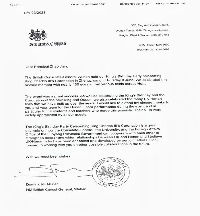 近日,英国驻武汉总领事馆向我校发来感谢信。信中对我校在国王查尔斯三世生日酒会暨加冕庆典活动中的精彩表