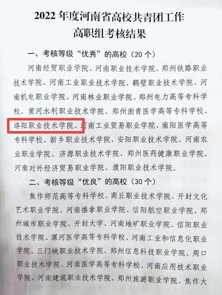近日,共青团河南省委公布了2022年度河南省高校共青团工作考核结果,洛阳职业技术学院共青团工作在高职