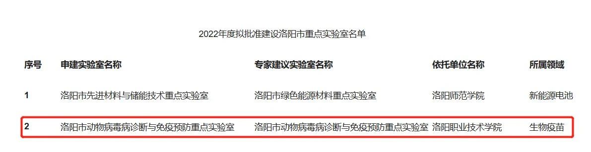 近日,洛阳市科技局公示了《2022年度拟批准建设的洛阳市重点实验室名单》,洛阳职业技术学院食品与药品