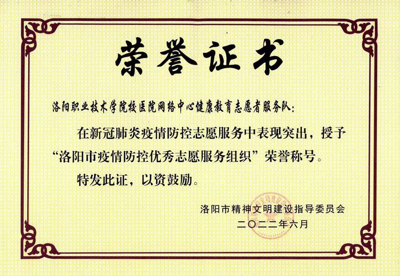 近日,市文明委下发《关于表彰洛阳市疫情防控优秀志愿服务典型》(洛文明委【2022】8号),我校获多项