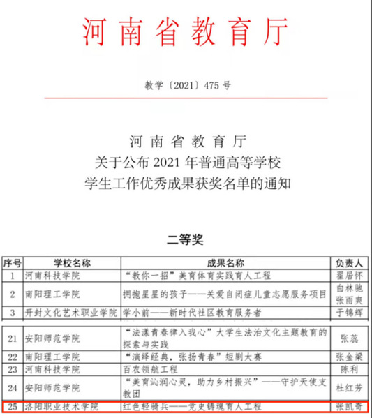 12月20日,河南省教育厅发布《关于发布2021年普通高等学校学生工作优秀成果获奖名单的通知》(教学