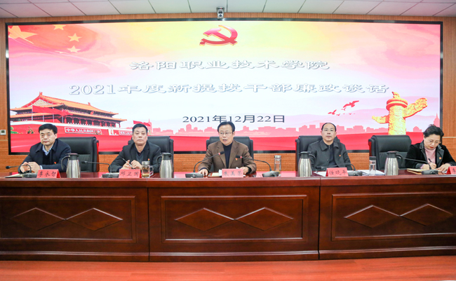 12月22日下午,我校党委组织2021年度38名新提拔干部进行集中廉政谈话,党委书记朱美荣,纪委书记