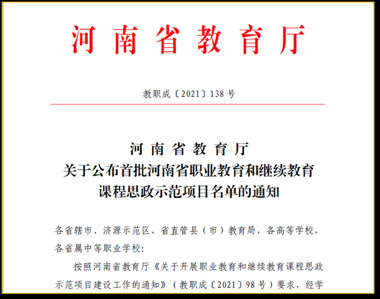近日,河南省教育厅公布了首批河南省职业教育和继续教育课程思政示范项目名单(教职成〔2021〕138号