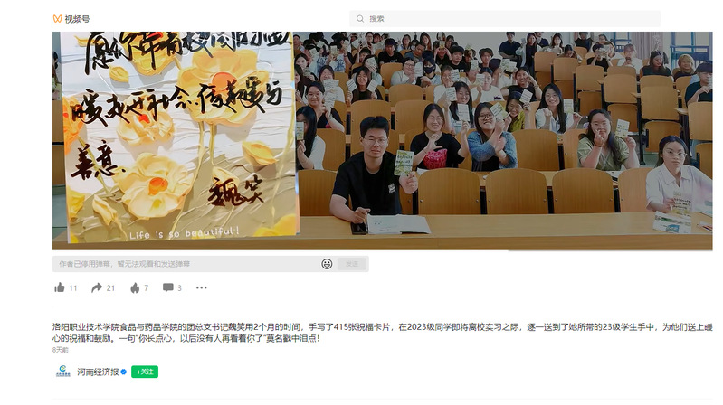 河南省教育厅:太暖了!在同学们即将离校实习之际,老师手写了415张祝福卡片,为他们送上暖心的祝福和鼓励!