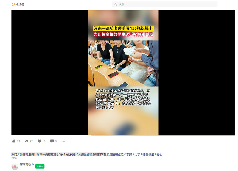 河南高教:双向奔赴的师生情!河南一高校教师手写415张祝福卡片送给即将离校的学生