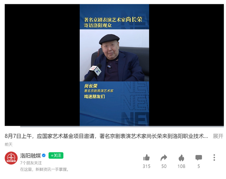 编者按:2023年8月8日,洛阳融媒微信视频号报道著名京剧表演艺术家尚长荣来到我校以“激活传统,融入