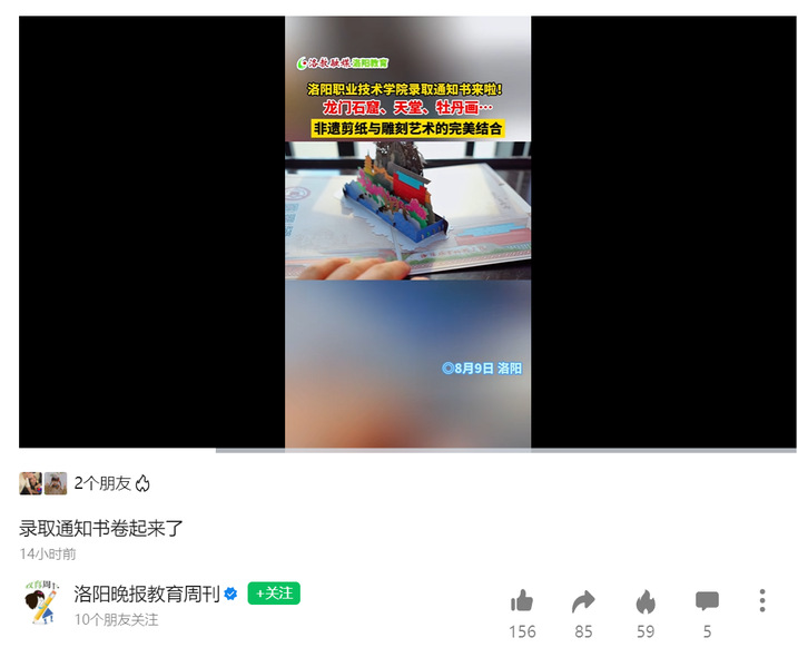 洛阳融媒微信视频号:2023级录取通知书将非遗剪纸艺术文化与雕刻技术完美结合