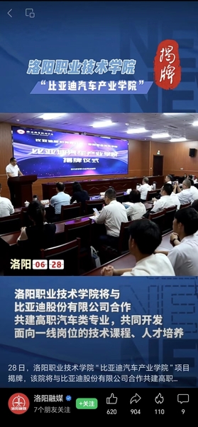 编者按:2023年6月28日,洛阳融媒报道我校“比亚迪汽车产业学院”项目揭牌。报道原文如下: