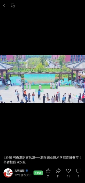 编者按:2023年4月20日,文明洛阳微信视频号报道书香洛职古风浓——我校春日书市。报道原文如下: