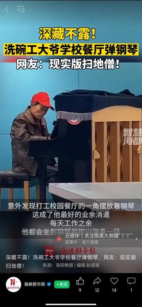 海峡都市报微信视频号:深藏不露!洗碗工大爷学校餐厅弹钢琴,网友:现实版扫地僧!