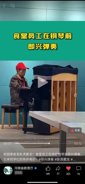 河南省教育厅抖音号、视频号:校园果真是卧虎藏龙!食堂员工在学校钢琴前即兴弹奏,引来同学们的阵阵喝彩!