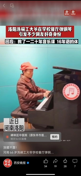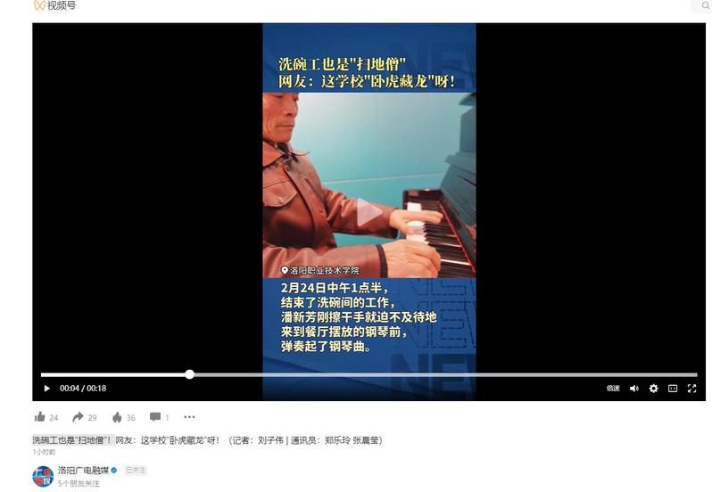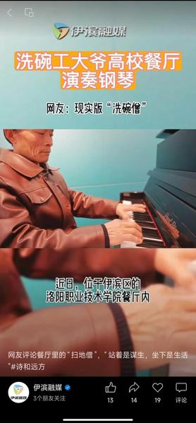 编者按:2023年3月1日,洛阳学习平台报道我校洗碗工流畅弹奏钢琴视频火爆网络。报道原文及相关链接如