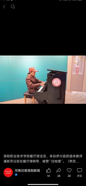 河南日报洛阳新闻微信视频号:洛阳职业技术学院餐厅保洁员,来自伊川县的退休教师潘新芳日前在餐厅弹钢琴,被赞“扫地僧”。