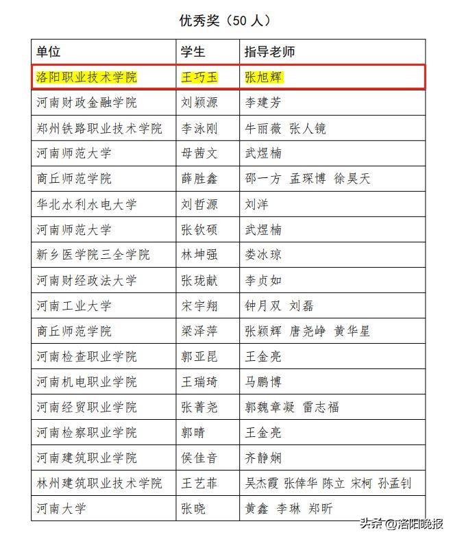 编者按:2022年11月9日,洛阳晚报报道洛阳一批高校学子获省级奖项,其中有我校学生王巧玉。报道原文