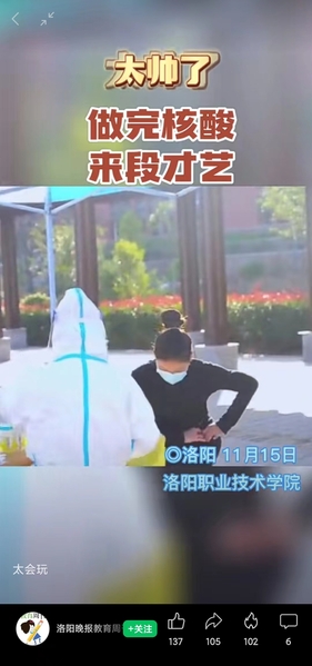 洛阳晚报教育周刊视频号:洛阳职业技术学院学生做完核酸,来段才艺,太会了!