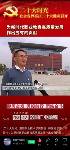 洛阳广电融媒视频号:【二十大时光】洛阳职业技术学院教授、微生物学博士张贺伟:为新时代职业教育高质量发展作出应有的贡献。