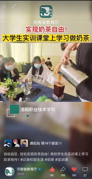 河南省教育厅抖音号、视频号:自给自足,轻松实现奶茶自由!高校学生在实训课上学习奶茶制作!