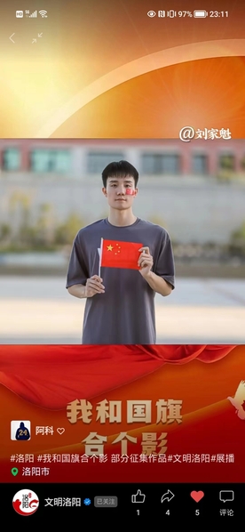 编者按:2022年10月4日,文明洛阳视频号发布我和国旗合个影视频,其中有我校学生,原图如下: