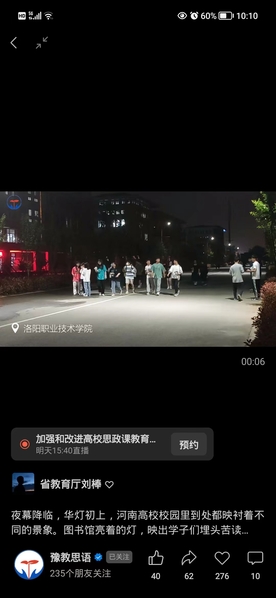 编者按:2022年5月3日,豫教思语官方微信视频号发布夜幕降临,华灯初上,河南高校校园里到处都映衬着