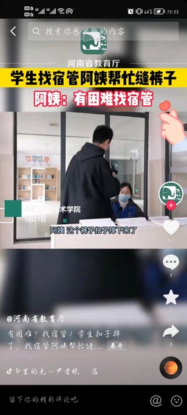 编者按:2022年3月22日河南省教育厅抖音号、视频号发布短视频《学生找宿管阿姨帮忙缝裤子》关注我校