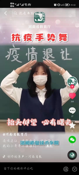 河南省教育厅抖音号、视频号:疫情退让,中国力量!快和各高校的小哥哥,小姐姐们一起跳手势舞,为抗疫加油!