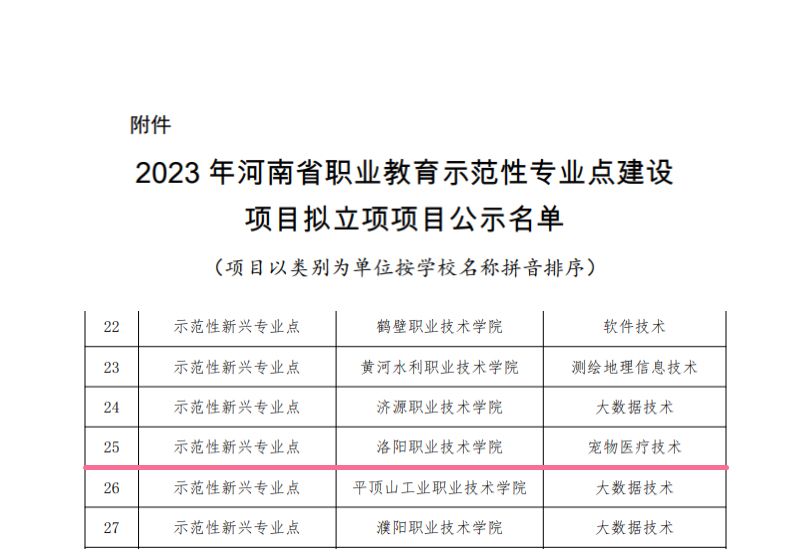 近日,河南省教育厅公布了2023年河南省职业教育示范性专业点建设项目拟立项项目名单,我校宠物医疗技术
