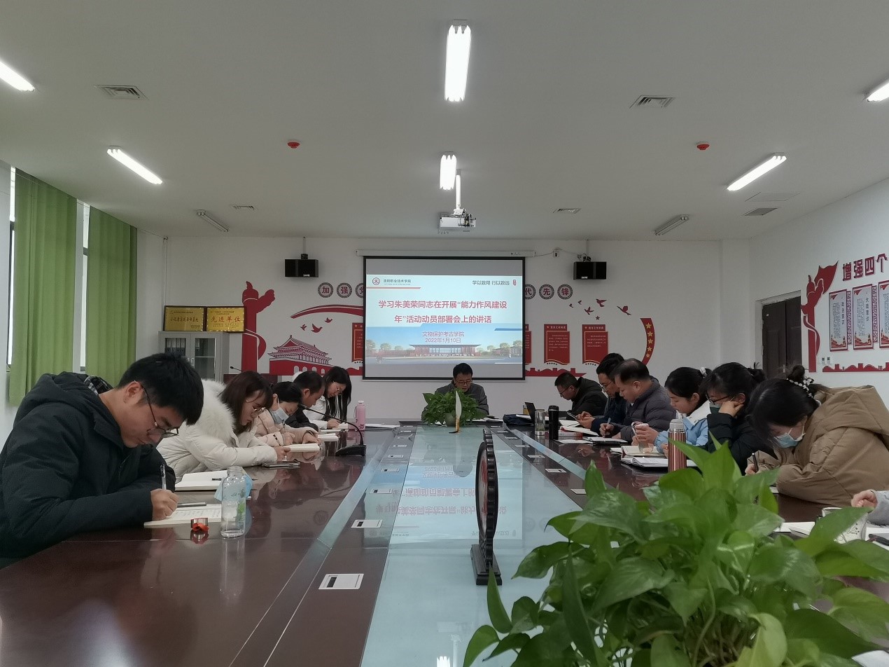 1月10日下午,文物保护考古学院召开会议,集中传达洛阳职业技术学院《关于在全校开展“能力作风建设年”活动实施方案》,深入学习校党委书记朱美荣在学校在开展“能力作风建设年”活动动员部署会议上的讲话精神,文物保护考古学院全体教职工参加学习。会议由党总支书记杨刚亮主持。