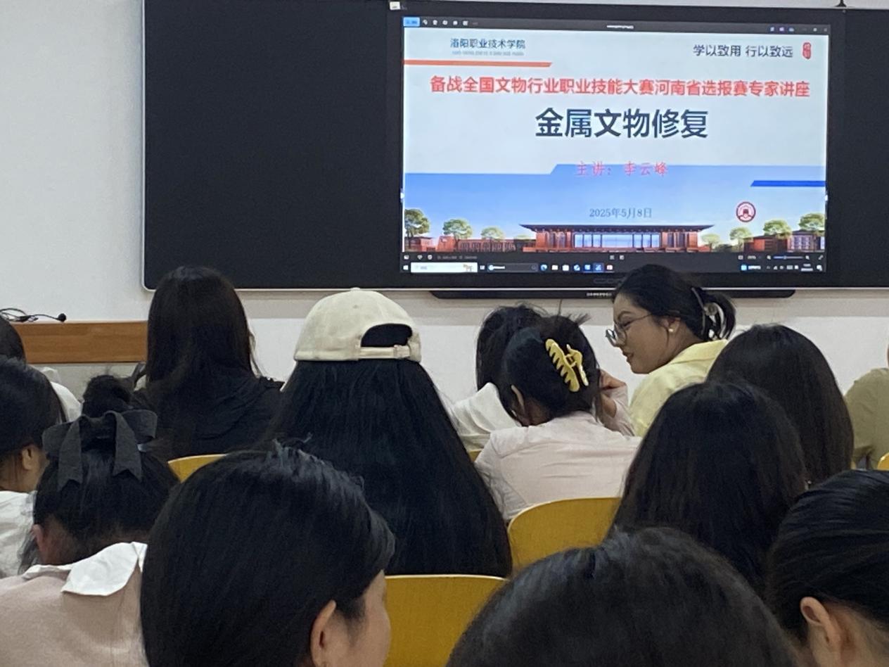 为备战2025年全国文物行业职业技能大赛河南省选拔赛,5月8日下午,文物保护考古学院特邀在2022年全国文物行业职业技能大赛金属文物修复师项目获得二等奖的文物修复专家李云峰到校开展金属文物修复专题讲座。文物修复与保护专业师生约90人到场聆听讲座。