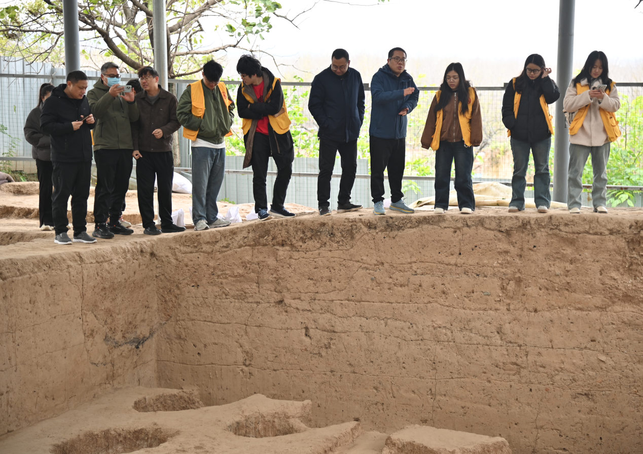 在苏羊遗址考古现场,谷向乐向师生们详细介绍了该遗址的考古发掘历程、文化内涵与保护现状。他结合正在开展的考古工作,生动阐释了苏羊遗址作为黄河中游重要史前聚落的学术价值,并分享了多年坚守考古一线的实践心得。同学们在谷向乐的引领下,近距离观察探方内的遗迹现象,亲手触摸历史遗存,对田野考古操作规程有了更为直观的认识。