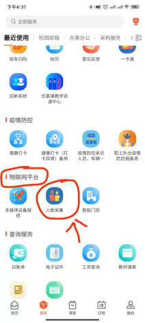我校校门、图书馆等闸机入口需扫脸进入。教职工在首次登陆多彩洛职后请尽快于APP内录入自己个人人脸信息,以方便进入我校各个扫脸闸机。人脸数据录入方式如下图所示: