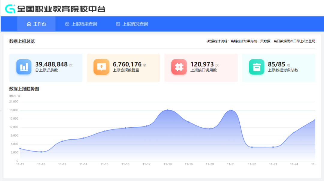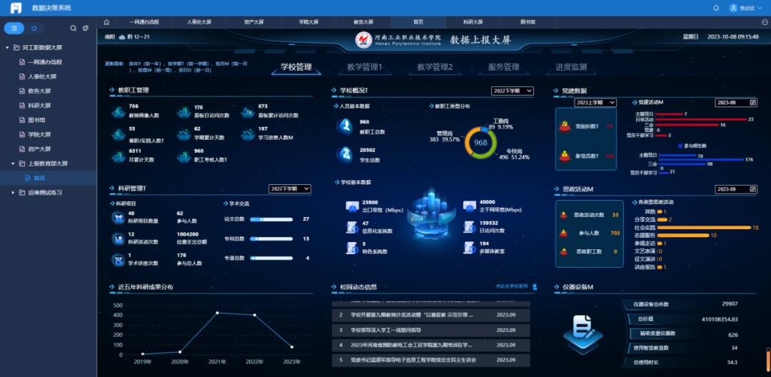 作为第一批职业院校数字校园建设试点单位,学校依据《全国职业教育智慧大脑院校中台高职数据标准及接口规范(试行)》,数据对接建设成果卓著,荣获2022年河南省信息化标杆学校荣誉。目前学校已完成85张表的数据对接工作,上报数据量600余万条。学校从完整性、及时性、准确性、一致性、唯一性和有效性六个方面,开展全面数据质量的监控,持续高质量与教育部智慧大脑中台开展数据交互。图10 智慧大脑数据对接展示大屏