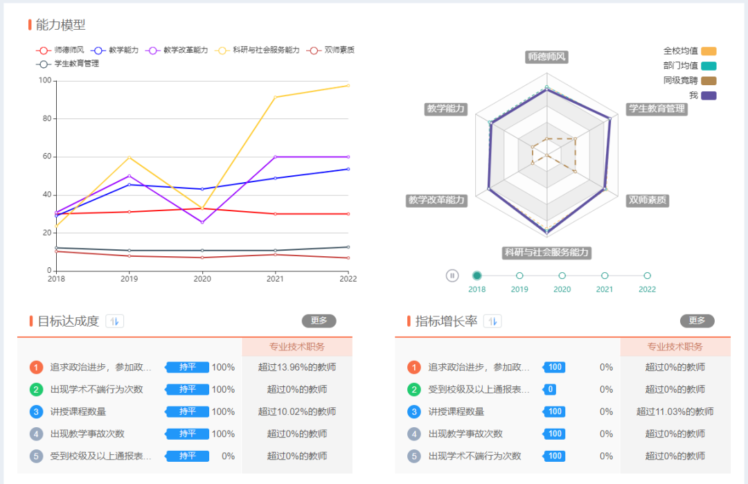 依托诊改系统中学生发展中心对学生的学业发展实施实时监控,通过科学规划专业预警参数指标,合理设置预警阈值,对学生发展大数据的实时采集分析并进行发展预警,学生知识和技能得到全面提升。依托诊改系统中教师发展中心,从教学管理、科研服务、学生管理等多个维度对教师进行相对科学的画像和评价,促进教师全面发展。
