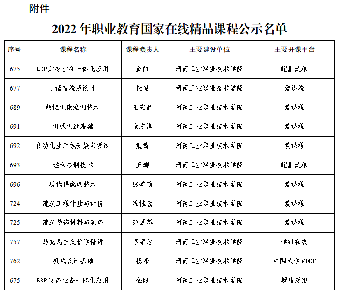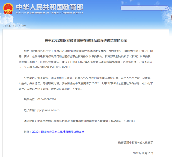 学校资源建设和供给能力得到持续提升,建成11门国家级精品在线开放课程、33门省级精品在线开放课程、155门校级精品在线开放课程。在教育部公布的2022年职业教育国家在线精品课程名单,学校11门课程成功入选,课程认定数量位列全国第一。