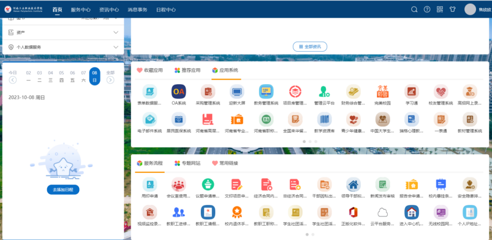 “让数据多跑路,师生少跑路”,建设一站式服务中心网上办事大厅。建设数字化校园统一身份认证平台,通过0A信息系统,集成上线公文流转、事务通知等120多个常规业务流程,实现学校、部门、个人三级数据管理。图8 网上办事大厅
