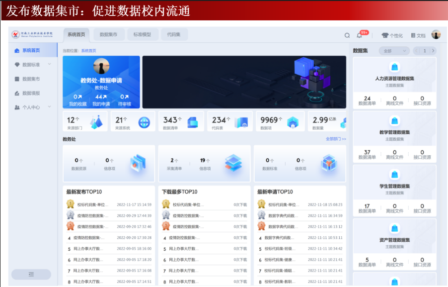 完善校本数据中心支撑,强化分析应用,提升学校数字化治理水平。健全数据管理与应用等制度规范,推动数据使用合约合规、绿色安全;强化数据服务与应用,促进日交换数据量逐步提升,从师生发展、专业建设、教育教学、生源与就业状态等维度开展基于大数据的教育治理分析,辅助学校现代化管理与决策。