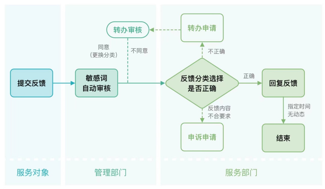 学校成立专项工作组,党政办为业务牵头及督导部门,党委宣传部、学生工作部为业务推广部门,信息化技术中心为技术支撑保障部门,其他业务部门为反馈落实单位,全面梳理服务师生的各项业务,确定问题分类和反馈流程。疫情期间共梳理出16个大类、38项服务的投诉(建议、表扬)等事项。图4 优化后的反馈流程