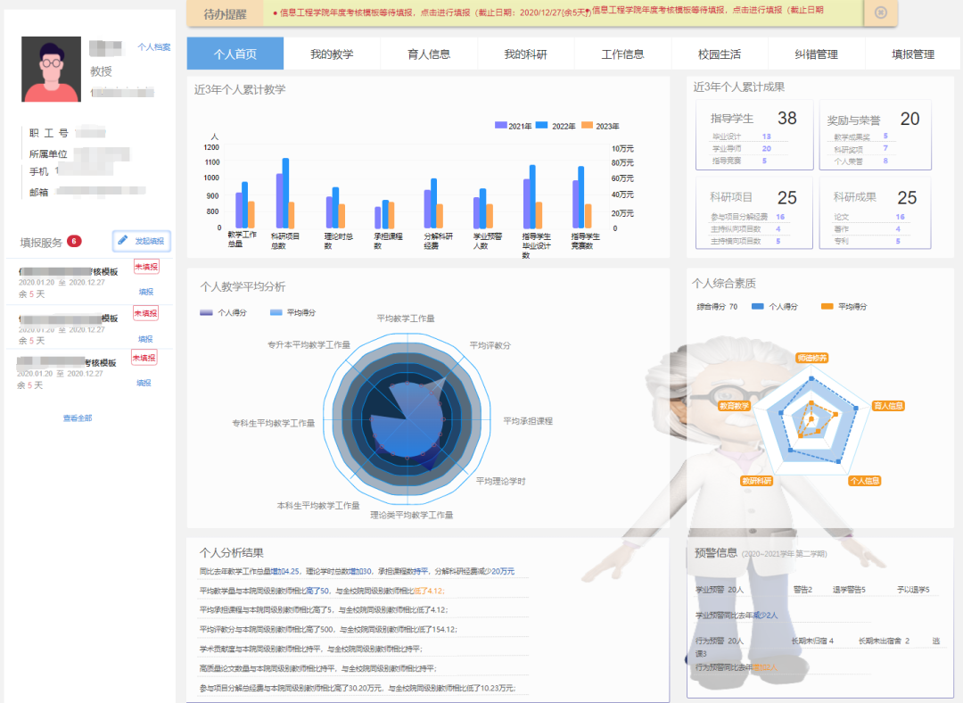 教师数据中心已从中心数据库抽取人事、财务、教务、科研、资产、图书、一卡通等20多个业务系统数据,为10个部门18个系统提供数据共享服务,对接数据总量89万多条,共享数据57万多条。利用现有数据发布轻量化数据填报任务63次,减少教师数据填报字段26项,增加教师的获得感和幸福感。