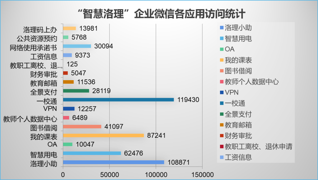 针对师生移动应用的使用习惯和发展趋势,将教师个人数据中心、公共资源预约、洛理码上办等服务管理类应用整合在“智慧洛理”企业微信,师生实现一次关注即可直达校内各类业务信息系统,可实现多个业务系统无缝切换。实现了“校务服务随时随地、校务应用触手可及”的理念。目前已有41680人师生关注“智慧洛理”,年平均访问量1500余万次。