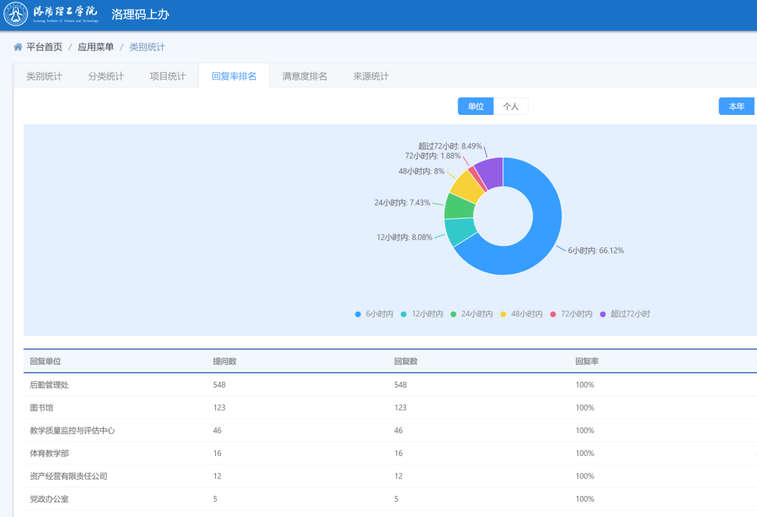“洛理码上办”自2022年11月24日正式上线以来,各院部逐级下发操作流程、功能介绍,同时学校官方渠道加强线上宣传,不到一个月的时间,学生的咨询、投诉、建议、表扬等各类反馈问题达到1276条。其中咨询和建议占83%左右,在这些咨询投诉中,相关受理老师积极给予回复,及时解决了学生们迫切所需的问题,获得学生肯定。据不完全统计,系统上线两个月后,超话微博等相关问题的投诉大量减少,消除了一些负面影响。