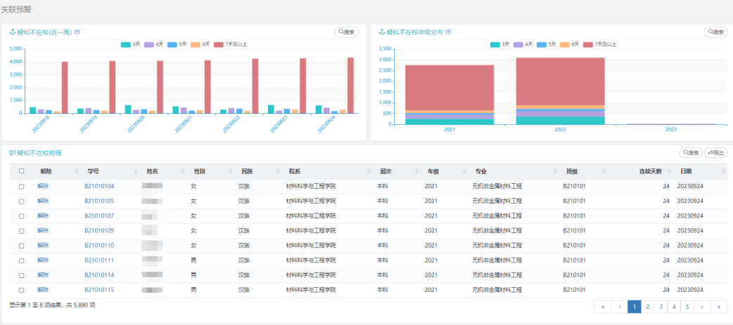 通过挖掘一校通平台的学生行为轨迹,建设基于一校通数据的学生行为分析和预警平台。平台具有学习仪表盘、图书馆预约、疑似失联学生预警等功能,为每位学生提供个性化建议和支持。建成以来,在疫情防控中精准定位疫情传播点2195个,在学生困难补助发放中精准投放补助436条。同时平台提供丰富的展现及交互能力,实现“用图形让数据说话”,以学生信息仪表板的形式,将学生的总体和个体信息汇总展示,将学术成绩、课程进度、参与活动、一卡通使用情况图形化展示,方便管理人员理解和使用数据,充分体现数据作为生产要素的价值。