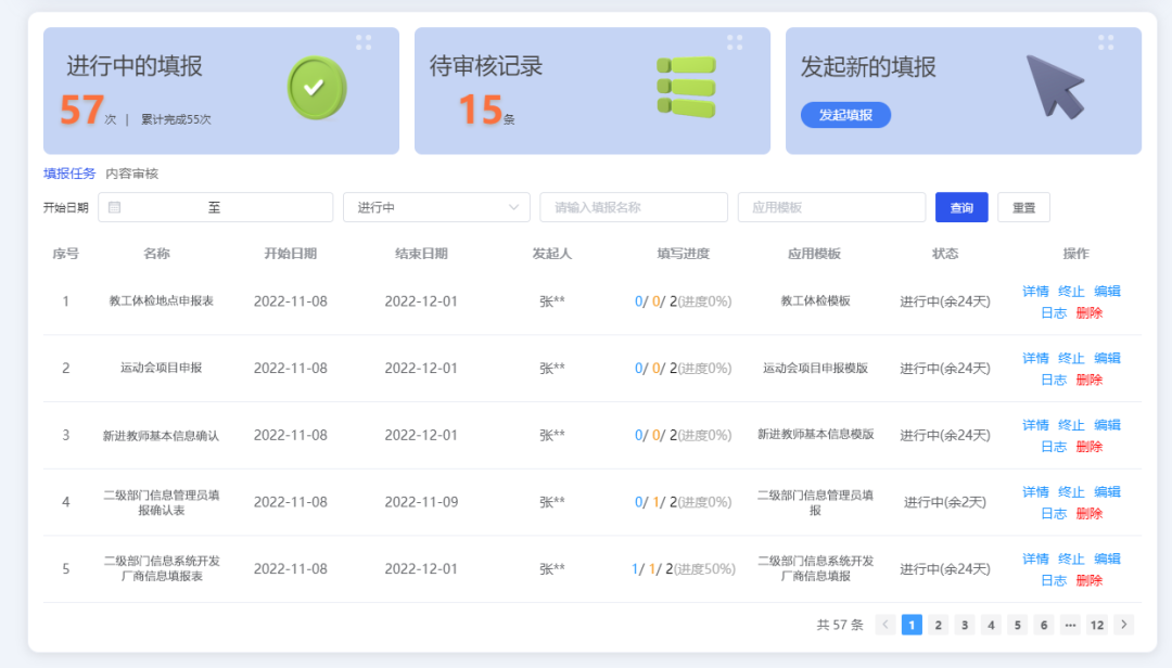 坚持绿色理念,践行节约、复用、便捷的原则,管理和设计师生填报任务,为数据填报提供一站式信息支持服务。将数据仓库中的师生数据按照教学、科研、人事等主题分类形成师生个人数据中心,在此基础上坚持“基础信息数据自动获取、业绩数据随时录入且经过审核后多次复用、主观内容自主填报”的原则,创建填报表单,尽量确保师生同一份数据最多填一次。