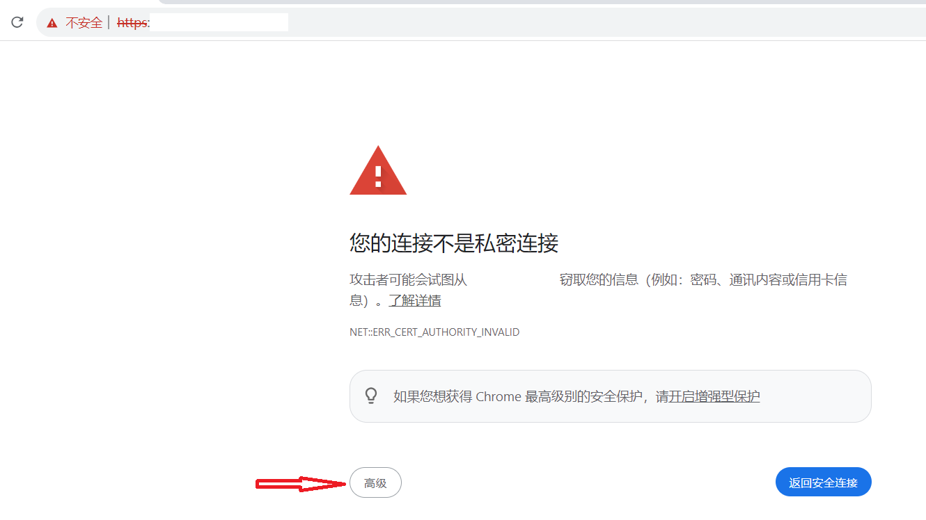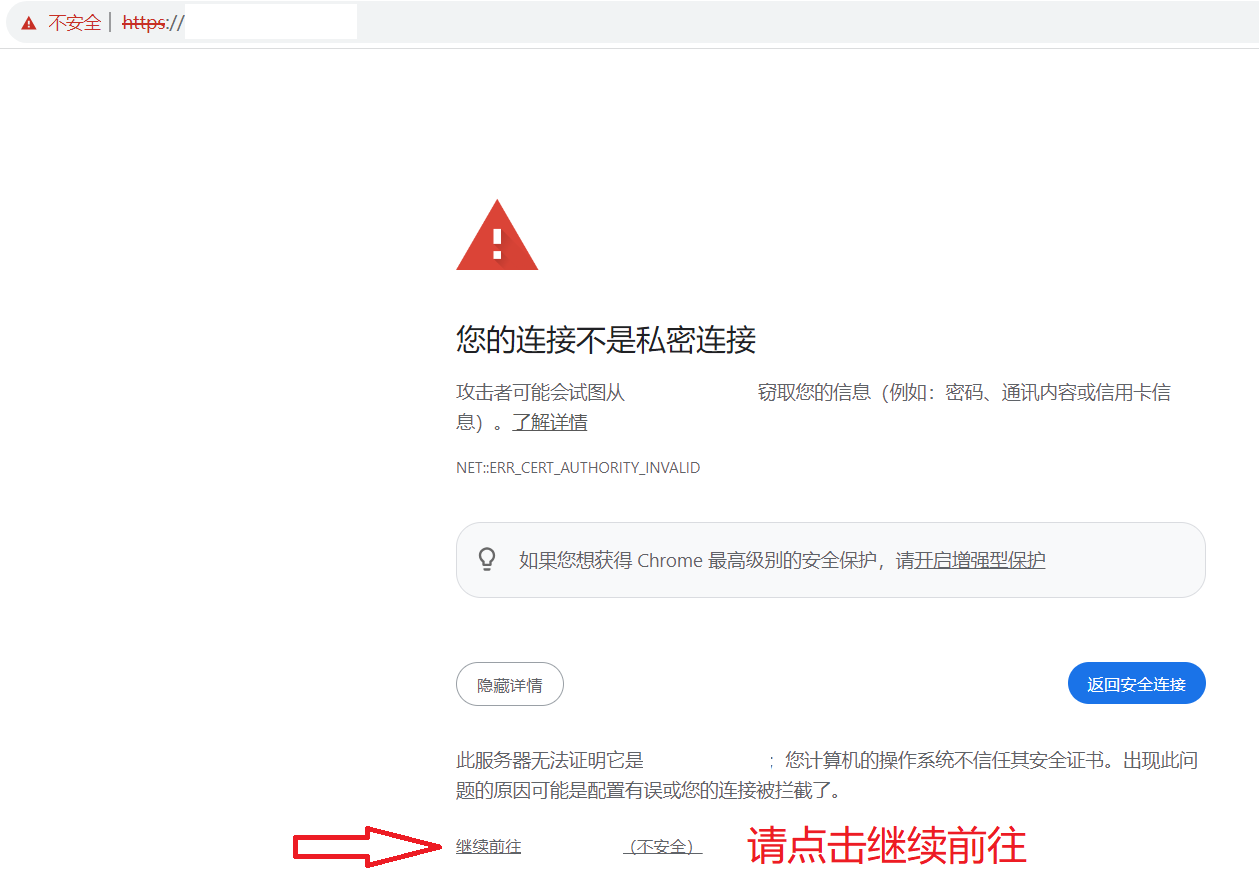 请根据页面提示,选择详情或者高级,点击继续访问即可。