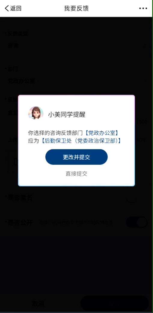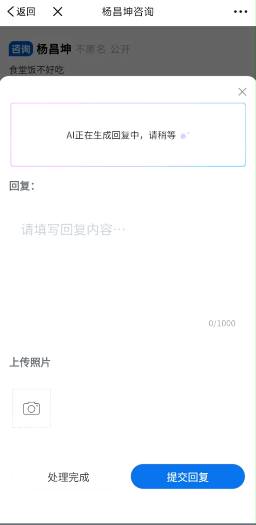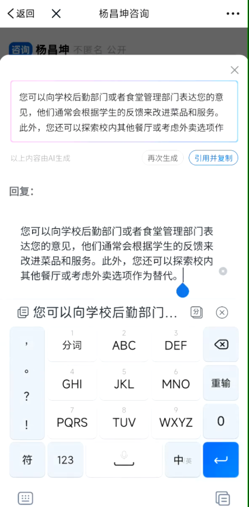 一是AI精准定位问题负责部门。师生在心声平台上提交问题时,小美同学将通过分析问题内容,智能推荐最合适的负责部门。师生可以选择接受小美同学的推荐,直接将问题提交至相关负责部门,也可以选择手动更改,继续按照自己的判断进行提交;二是AI辅助智能答复。平台具备智能问答功能,能够协助管理员对一些常见问题进行智能化回复。在问题回复页面,教师只需点击回复,小美同学即可识别问题内容,并结合历史相似问题的回复以及自身的知识库,生成一段智能回复。教师可以选择直接引用、复制并提交小美同学生成的回复,或者根据个人需要进行进一步的修改和润色。若对生成的回复不满意,教师还可以选择让AI重新生成新的回复内容。三是AI的自我学习功能。随着师生心声问答数据的不断积累,小美同学将持续学习并优化其知识库,以提升自身的服务能力。这不仅有助于提高问题处理的效率,也将为学校管理师生心声提供更加精准和高效的支持。