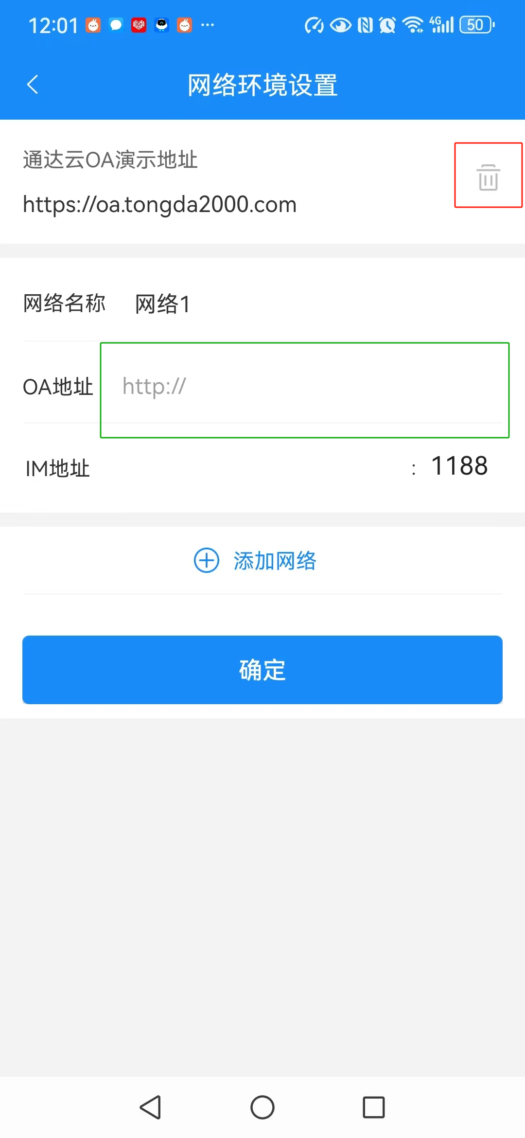 3、点击删除演示地址,在绿框处输入(注意冒号用半角输入法)https://oa.lypt.edu.cn:86