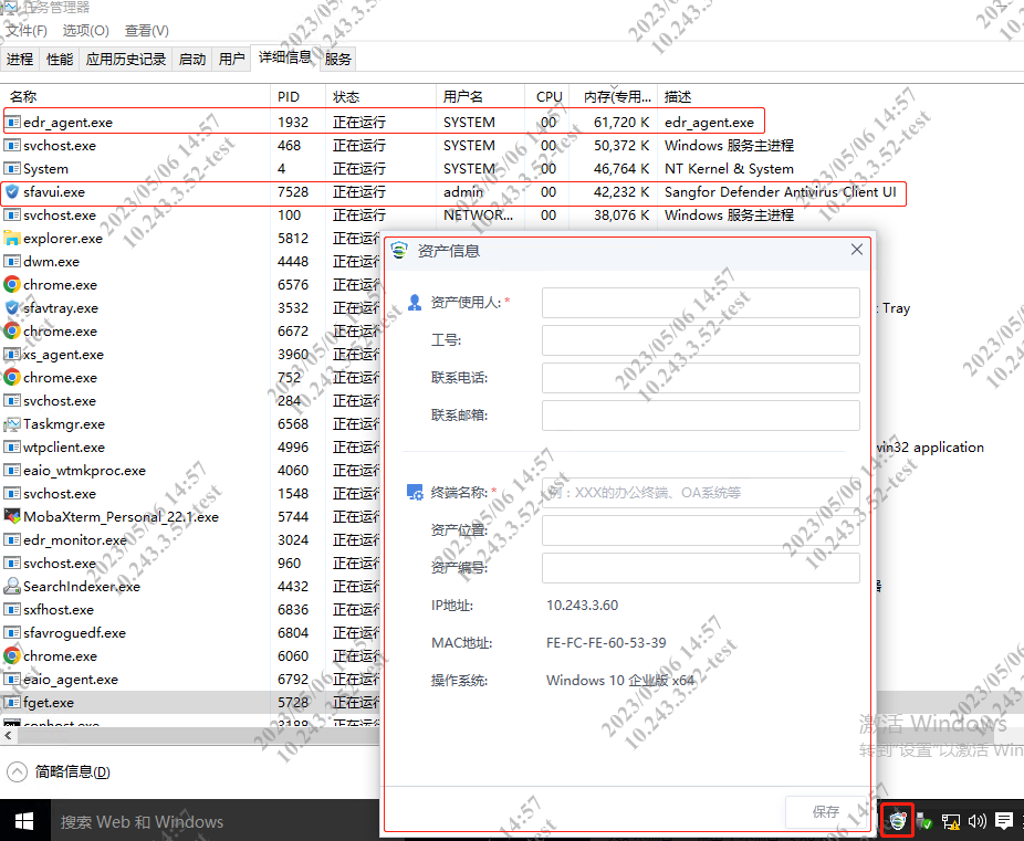 aES安装完成后,终端右下角出现aES角标,弹出资产登记(按管理端Mgr策略配置是否强制填写),也可在任务管理器看到edr_agent.exe核心进程与sfavui终端ui页面进程正在运行,此时为完成安装部署。