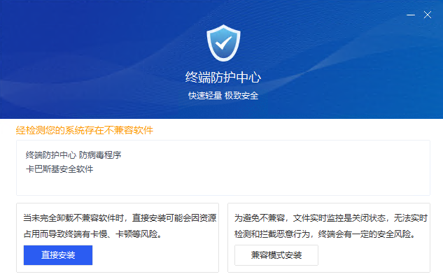 PS:已经安装了其它安全软件的电脑再安装aES时,aES在安装前会自动检测到与该软件不兼容,弹窗由用户选择“直接安装”或“兼容模式安装”,如下图。